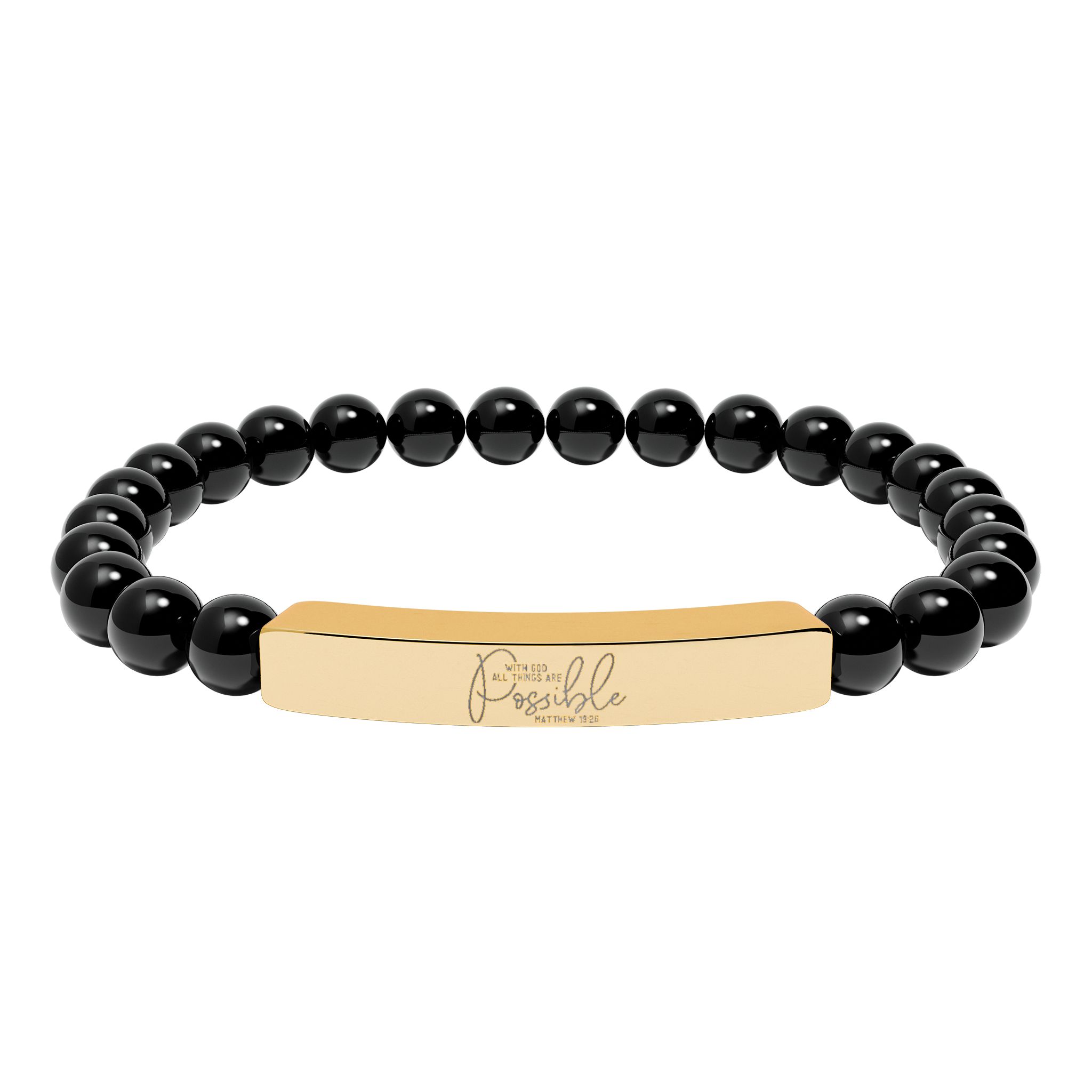 Carry a meaningful reminder of faith with this Engravable Natural Stone Beaded Bar Bracelet. Featuring natural stone beads and a sleek bar engraved with the words “With God All Things Are Possible,” this bracelet blends spiritual inspiration with everyday style. Comfortable to wear and easy to layer, it makes a thoughtful gift for encouragement, prayer, or special occasions.