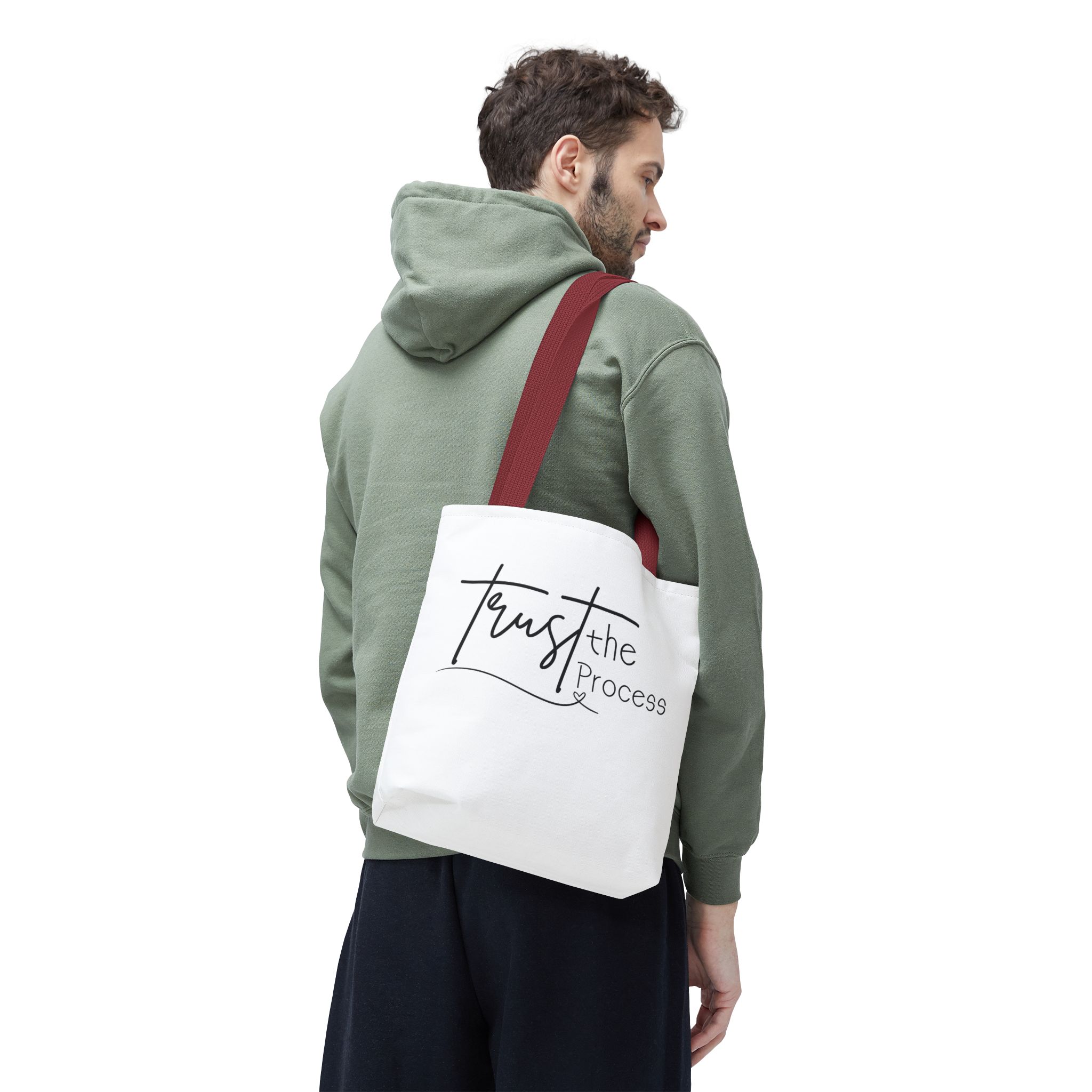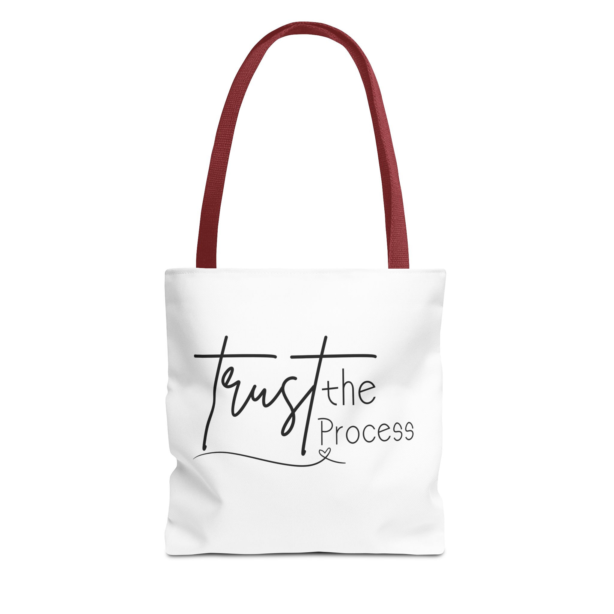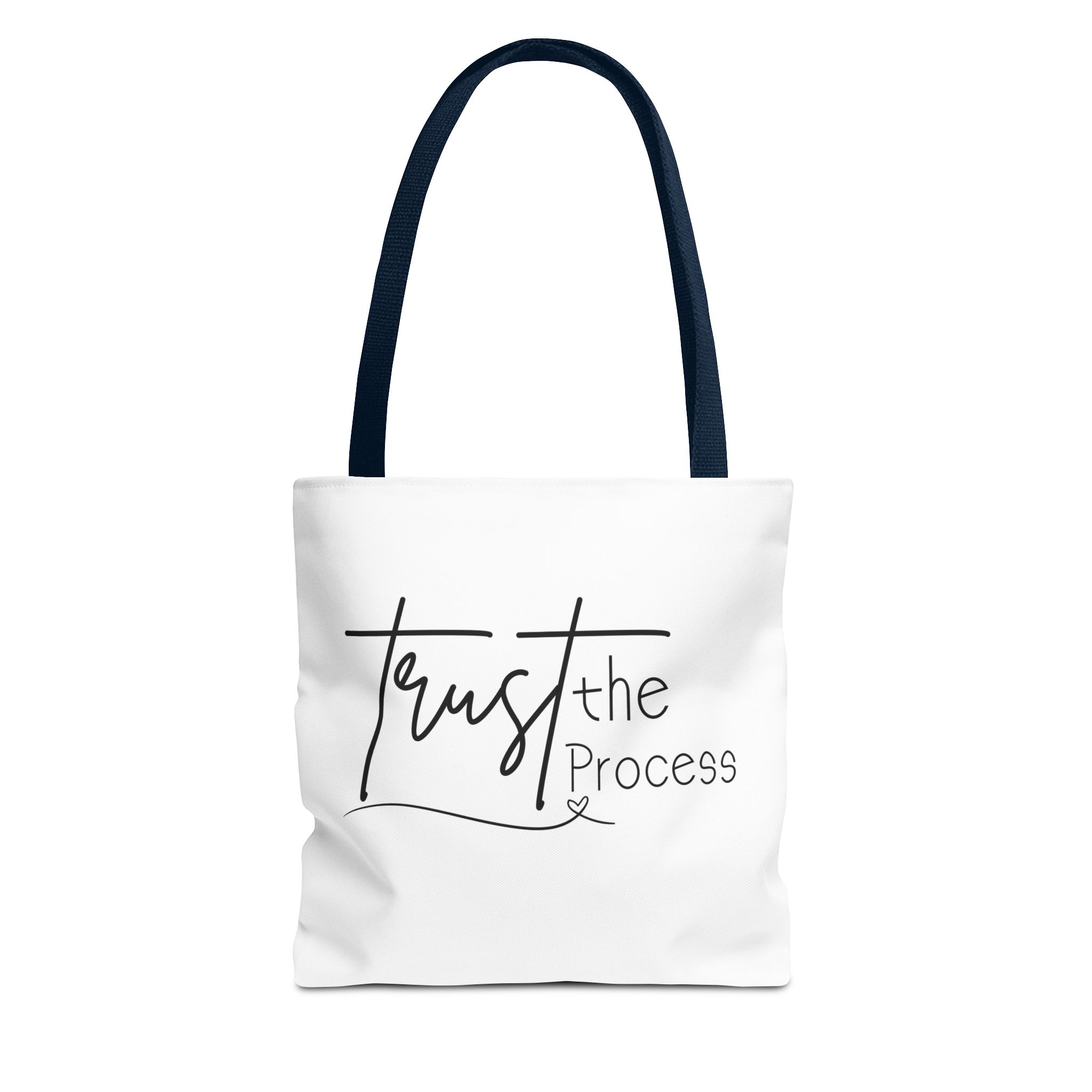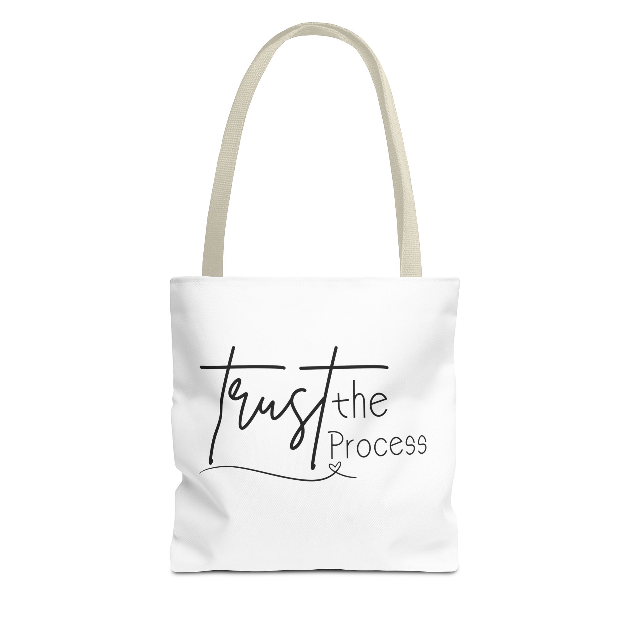 Carry this Trust the Process tote and let its quiet message steady your steps. The canvas-like polyester holds its shape and keeps your essentials organized with boxed corners and a roomy main compartment. Reinforced handles sit comfortably on the shoulder, stitched twice where you need strength most. Whether you’re heading to a studio session, a farmer’s market, or a late-night work sprint, the simple script reads like a small reminder: keep going. The subtle black inner seams and choice of five handle colors let you pick a look that fits your rhythm.